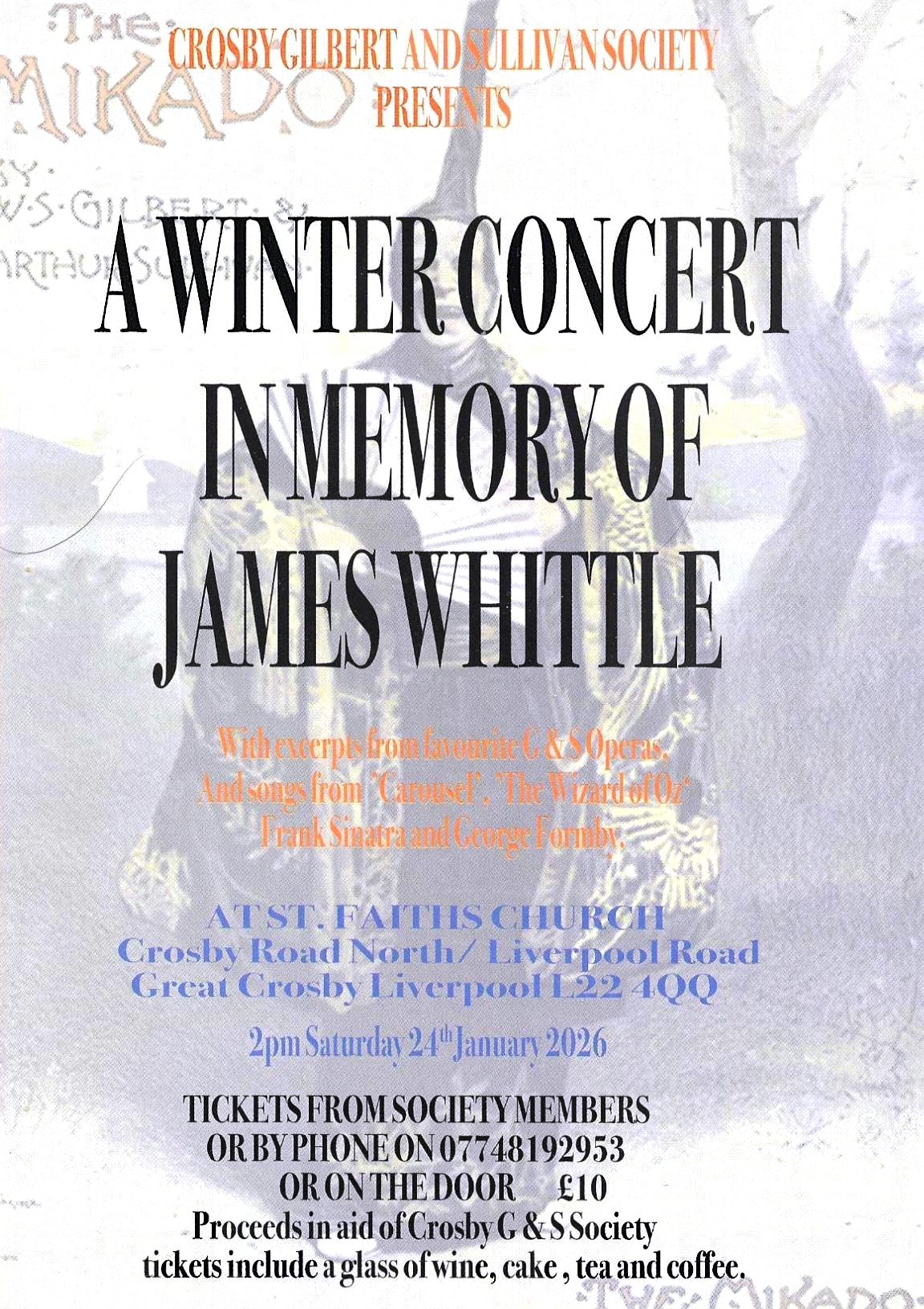 Proceeds in aid of the Crosby Gilbert and Sullivan Society. Charity Number 257348.